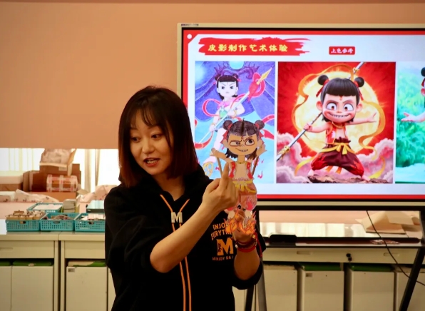 活动伊始,主讲老师首先讲述了哪吒“陈塘关诞生”“闹海抽龙筋”等故事,又向同学们详细介绍了皮影的历史传承以及制作工艺。皮影作为传统戏剧里的“老戏骨”、非遗家族的尊崇成员,历史源远流长。西汉时初露雏形,宋代已十分兴盛,曾是街头巷尾的“流量担当”。随后,在主讲老师的带领下,同学们化身“小非遗传承人”,精心绘制属于自己的哪吒皮影。在制作过程中,同学们有的边画边与哪吒“交流”,有的为其设计酷炫的武器装备,不多久,小哪吒便在同学们的手中诞生啦!“哪吒闹海”皮影秀随即精彩上演,孩子们操控皮影,引得教室欢笑连连、掌声不断。