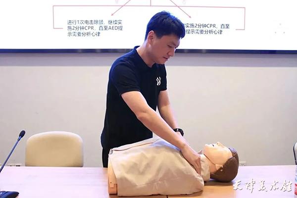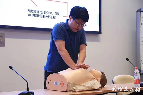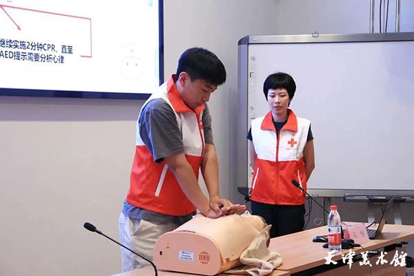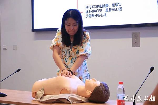 为强化培训实效,讲解结束后,馆内员工积极参与模拟训练。随着冯老师的口令,员工们将理论知识转化为实战技能,真正掌握了徒手心肺复苏(CPR)和利用自动体外除颤仪(AED)的流程和方法。