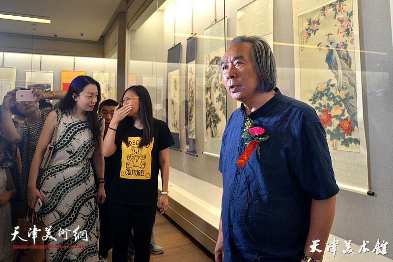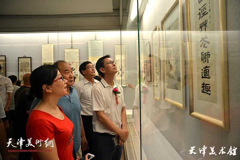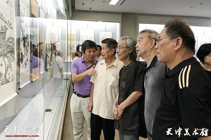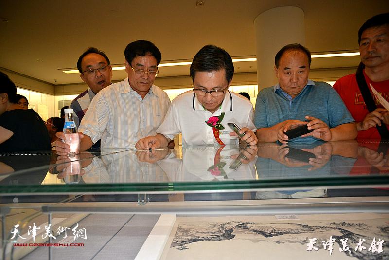 赵毅、刘家栋、邢立宏、卢炳剑、李建华在画展现场观看画作。