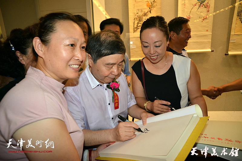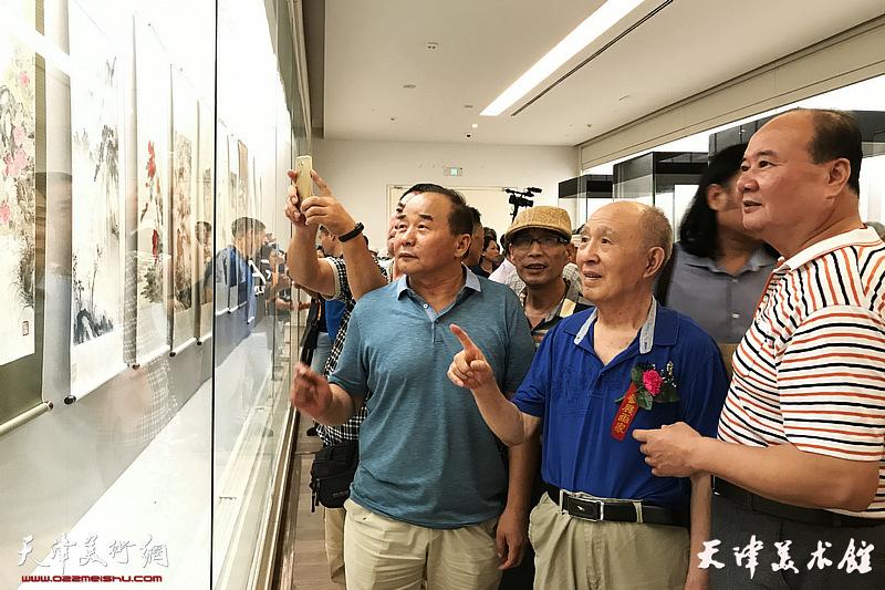 张洪千、姚景卿、贾万庆、孟昭晏、王长海在画展现场观看画作。