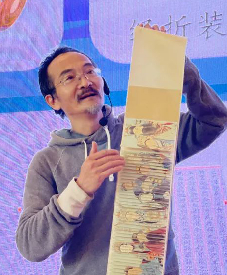 主讲老师先向同学们讲解了中国书籍装帧的历史,龙鳞装是在卷轴装和经折装之间出现的一种装帧样式,龙鳞装页面鳞次相积,遇风则灵动翻飞。