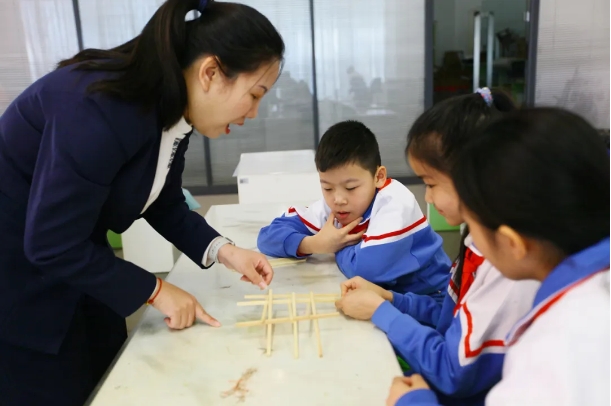 之后主讲老师通过对《清明上河图》《江山秋色图》等传世名画及闽浙一带深山中现存木拱廊桥的对比讲解,引出本次课程主角——贯木拱桥。为加深同学们的理解,主讲老师现场演示了贯木拱桥的搭建实验,引来同学们一阵惊叹与欢呼,同学们还站在木构架上亲身感受它的承重力。之后,同学们分组尝试用小木棍搭建小木桥,并在实践中思考营建一座木拱桥需要具备哪些条件。