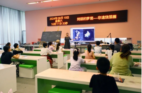 七夕节,又称乞巧节、女儿节,是中国传统的节日之一。拥有丰富的文化内涵和多姿多彩的节日习俗,蕴含着独特的中式浪漫,家喻户晓的牛郎织女故事,纤云弄巧、人间乞巧的妙趣,传承着中国人自古以来的美好情感和精神追求。为弘扬中华民族优秀传统文化,营造浓厚的浪漫节日氛围,更好地满足广大市民游客多元文化需求,天津美术馆推出“七夕”系列活动,吸引近6000人,共度七夕佳节。当天下午,天津美术馆七夕特别活动“绮丽的梦境——非遗烧箔画”准时开课。非遗烧箔画,又称贴箔,因其精湛的技艺和独特的艺术风格,被列入第二批国家级非物质文化遗产名录,是中国金属工艺中的瑰宝。通过热处理或化学反应,金属箔产生变化莫测的色彩和肌理,从而诠释出中式美学所蕴含的独特与优雅。