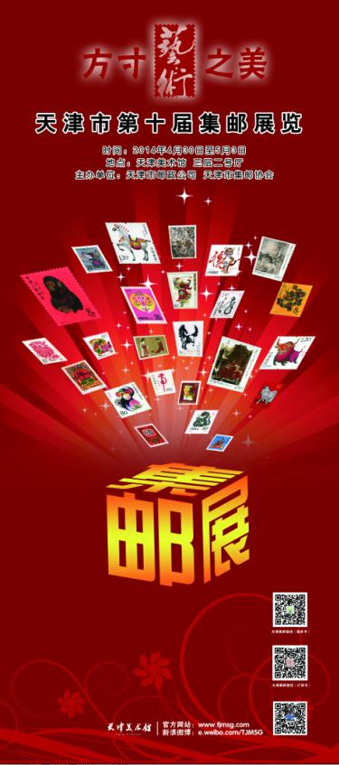 由天津市邮政公司与天津市集邮协会举办的“方寸艺术之美——天津市第十届集邮展览”将于4月30日——5月3日期间在天津美术馆展出。本届邮展是一次全面展示天津地区集邮水平的盛会,它将带您一同走进方寸间的艺术殿堂,让您亲身感受方寸间的艺术之美。集邮既是一项娱乐民众、有益民生的文化事业,也是一个满足民众精神文化需求的文化产业,对推动社会文化的繁荣发展具有深远的意义。本届