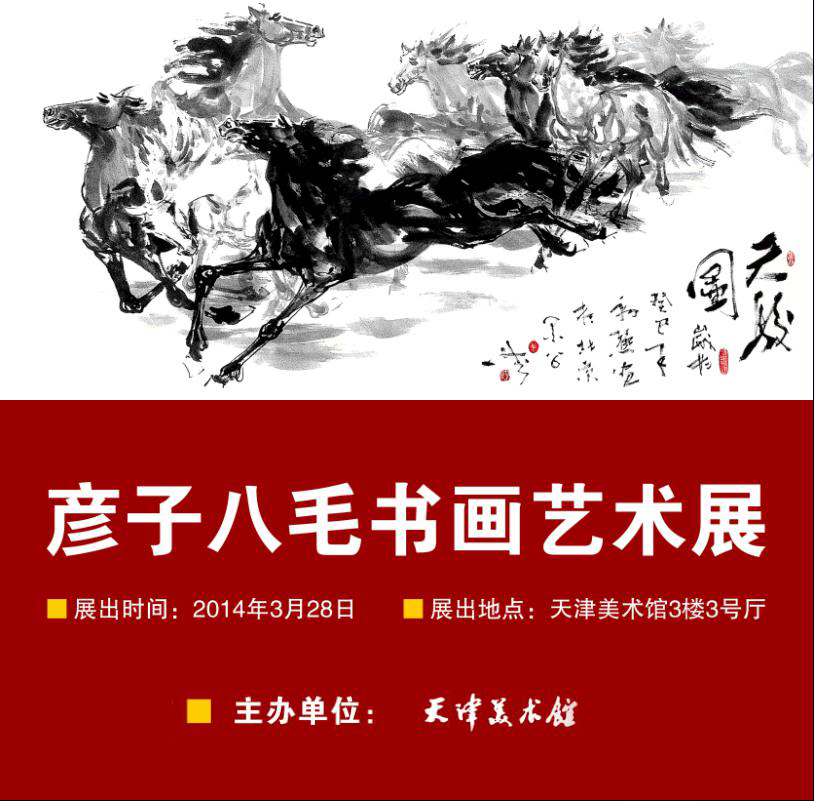 “彦子八毛书画艺术展”将于2014年3月28日——4月18日期间在天津美术馆展出。彦子八毛本名彦智勇。师从黄胄,著名当代实力派画家,国际书画家协会会员,新疆天山画院院长,天津大学中文系毕业。毕业后援疆在大西北坚持绘画二十多年,绘画多以表现中国西部风土人情为主。他的作品相继被人民大会堂、毛主席纪念堂等单位及国内国外收藏家收藏,为当代中国画坛中最具写实功力的中青年画家