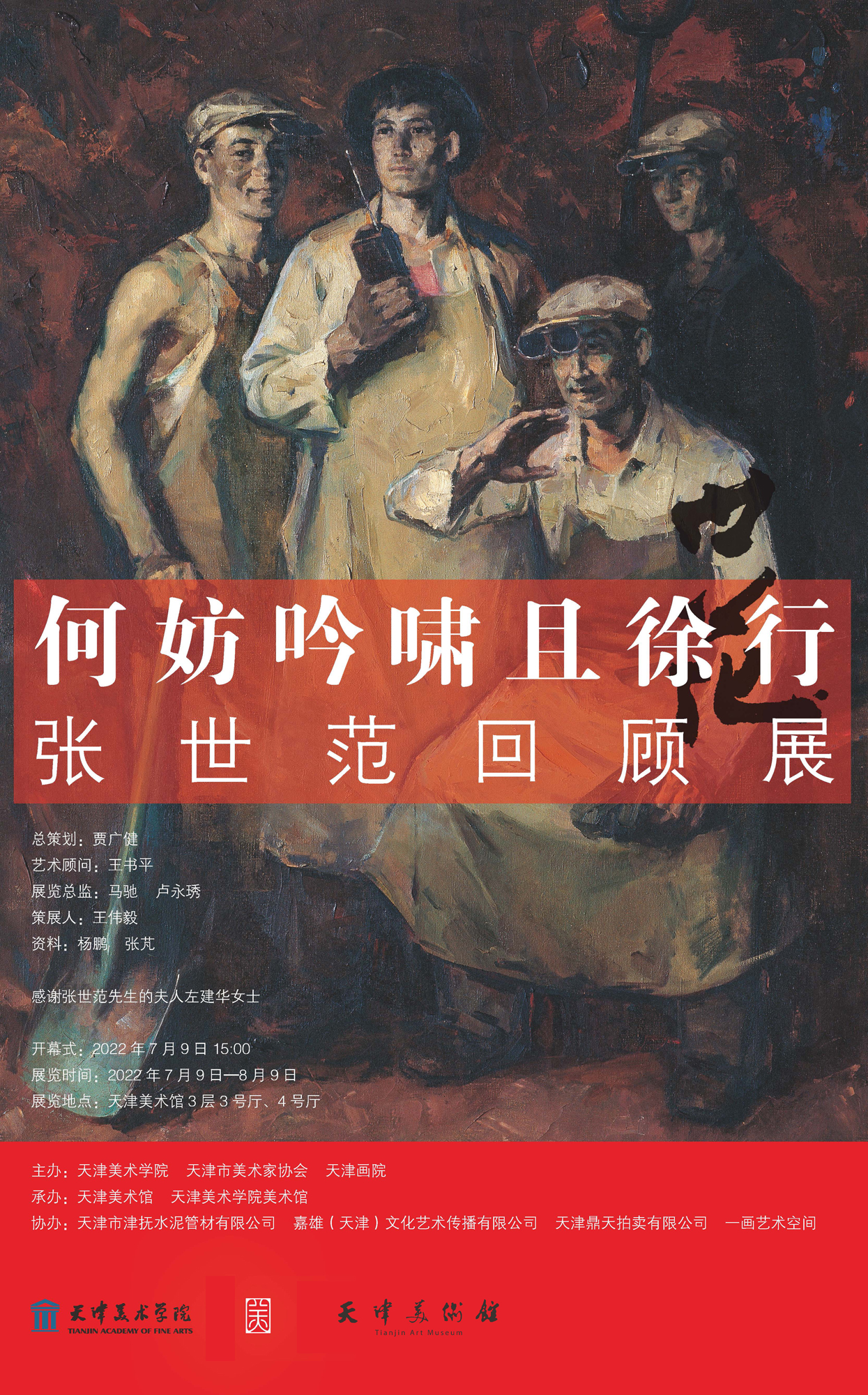 “何妨吟啸且徐行——张世范回顾展”于2022年7月9日至8月9日在天津美术馆三层3、4号展厅举办。此次展览由天津美术学院、天津市美术家协会、天津画院主办,天津美术馆、天津美术学院美术馆承办,天津市津抚水泥管材有限公司、嘉雄(天津)文化艺术传播有限公司协办。张世范(1936-2012)先生,几十年来投身于艺术教育、艺术创作和天津美术学院的发展,将艺术视作生命的一部分,在行政、