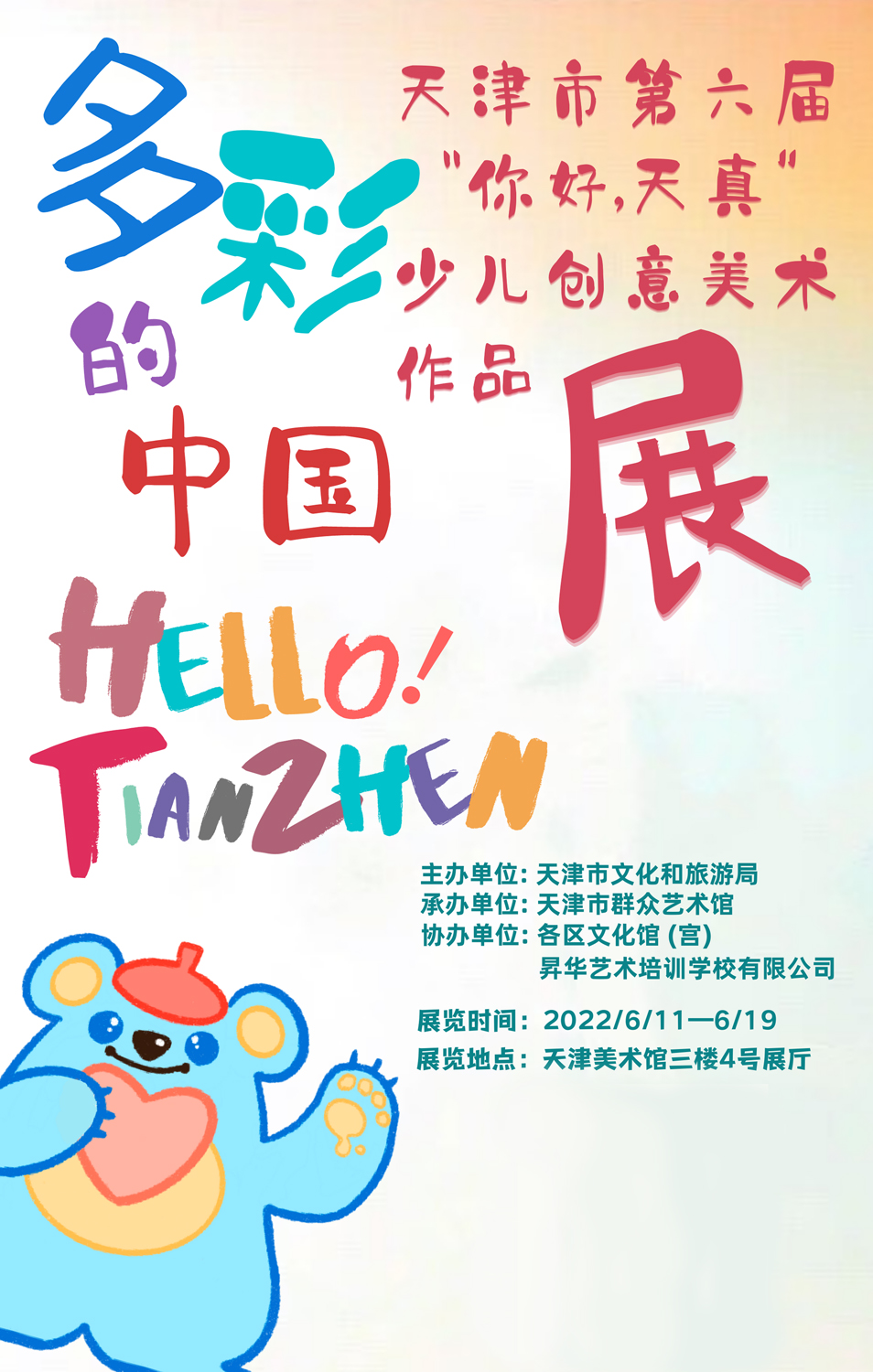 “多彩的中国”天津市第六届“你好,天真”少儿创意美术作品展将于2022年06月11日至6月19日在天津美术馆三层4号展厅举办。此次展览由天津市文化和旅游局主办,天津市群众艺术馆承办,各区文化馆(宫)、昇华艺术培训学校有限公司协办。天津市群众艺术馆设立天津市“你好,天真”少儿创意美术系列活动,为少年儿童搭建一个相互学习、交流、展示的平台,通过各类创意美术体验活动,让孩子