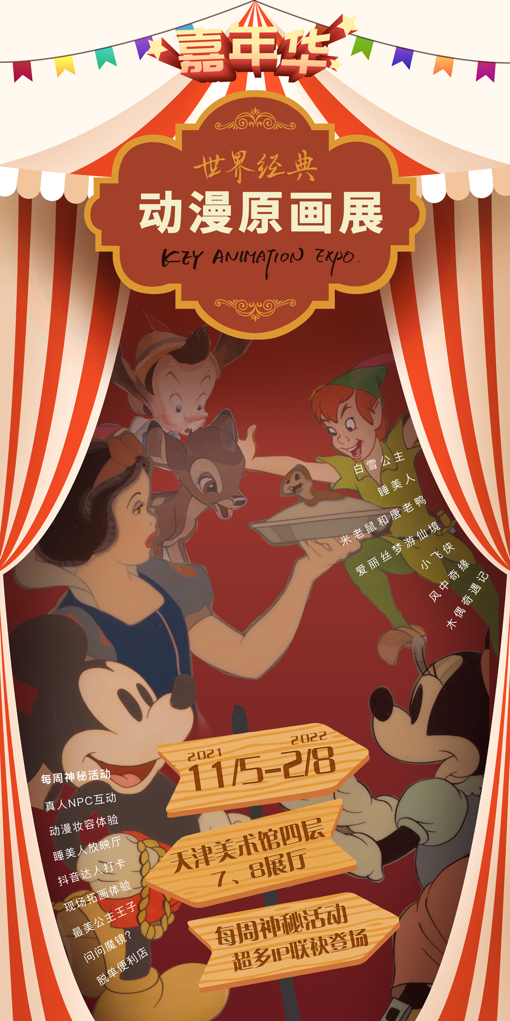 由天津美术馆、居墨堂(天津)文化有限公司共同主办的“世界经典动漫原画展·嘉年华”展览将于2021年11月5日在天津美术馆7.8号展厅与广大观众见面。此次展览共展出世界经典动漫原画作品共120组339件。展览通过四个版块梳理了自20世纪30年代至90年代末,从北美到亚洲的经典动漫原画作品;其中包括世界第一部长篇彩色动画作品《白雪公主》、《米老鼠和唐老鸭》、日本的《铁臂阿童木》、