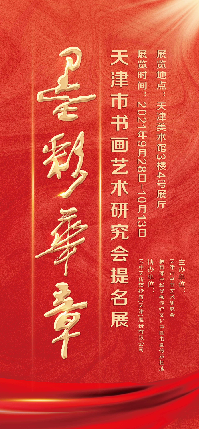 适逢国庆即将来临之际,由天津市书画艺术研究会、教育部中华优秀传统文化中国书画传承基地联合主办,云中天传媒投资(天津)股份有限公司协办的墨彩华章——天津市书画艺术研究会提名展即将在2021年9月28日在天津美术馆开幕。天津市书画艺术研究会是服务于市政协和统一战线工作的群众性社会团体,多年以来,努力为繁荣天津美术事业不懈奋斗,组织、举办的众多书画活动,受到社会各界的