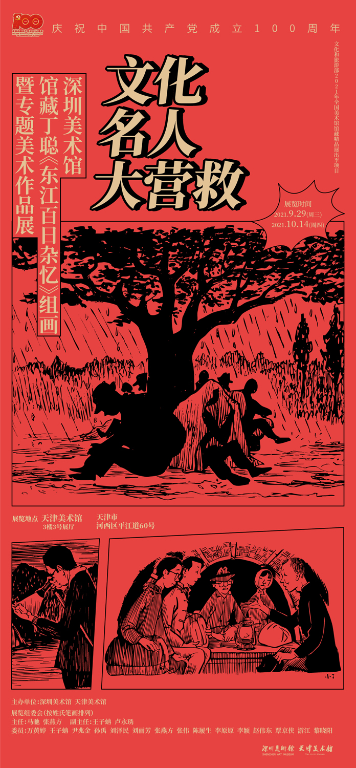由深圳美术馆、天津美术馆主办的“文化名人大营救——深圳美术馆馆藏丁聪《东江百日杂忆》组画暨专题美术作品展”于2021年9月29日在天津美术馆拉开序幕。此次展览以“文化名人大营救”为主题,从深圳美术馆馆藏丁聪先生的组画开始讲起,结合有关文化名人大营救主题的美术作品和文献资料,向观众讲述这一重要的历史事件,扩大民众对于这段历史的关注,加深理解党中央爱护知识分子、坚持