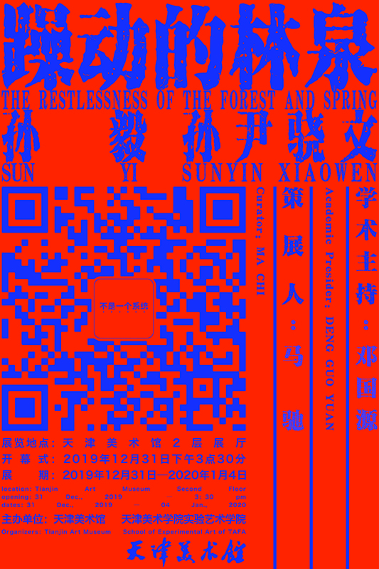 2019年12月31日,由天津美术馆主办的“躁动的林泉——孙毅、孙尹骁文实验艺术展”于天津美术馆二层2号展厅拉开帷幕。此次展览分为两个部分,一部分是装置,一部分是影像。这是孙毅与孙尹骁文二人艺术小组创作的作品,体现了这两位艺术家对于当代社会中信息图像的海量覆盖与人们个性化表达的思考与实践,并且展开了对于传统人文语境下的艺术与当代艺术之间的沟通与链接。在艺术语言上,