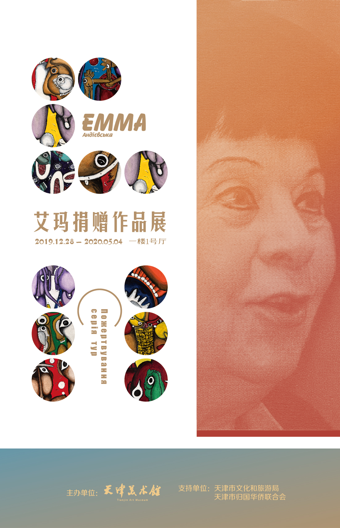 由天津美术馆主办的“艾玛捐赠作品展”将于2019年12月28日在天津美术馆一号展馆展出。展览将展出艾玛·安季耶夫斯卡娅的73件作品。艾玛·安季耶夫斯卡娅于1931年3月19日出生在乌克兰东部的顿涅茨克市(当时为斯塔利诺市)的一个知识分子家庭:母亲是生物学教师,父亲是化学家兼发明家。成年后获美国国籍定居在德国慕尼黑。艾玛取得过哲学和语言学硕士学位,出版多部诗集、散文集。她的