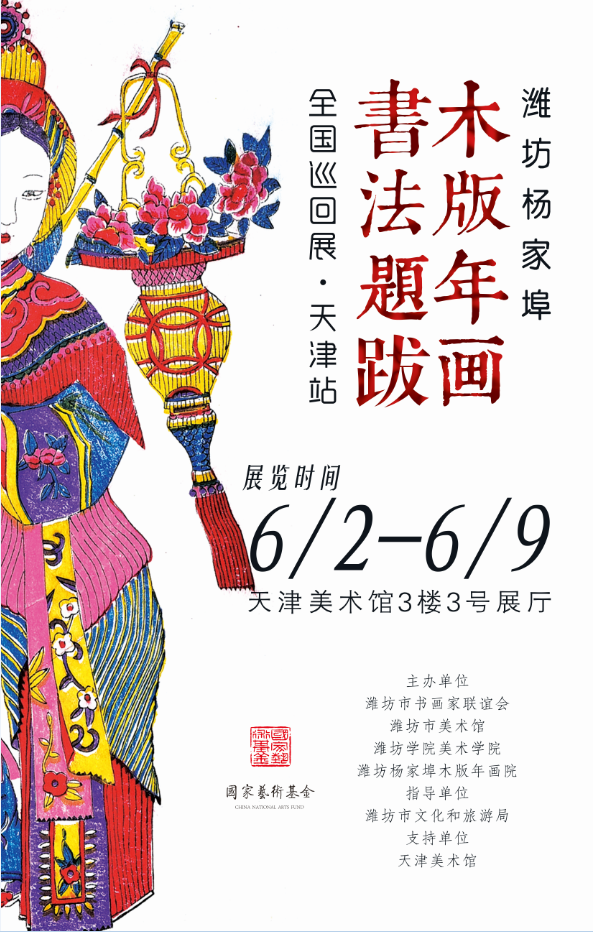 由国家艺术基金资助,潍坊市书画家联谊会、潍坊市美术馆、潍坊学院美术学院、潍坊杨家埠木版年画院主办,潍坊市文化和旅游局指导,天津美术馆支持的“潍坊杨家埠木版年画书法题跋全国巡回展•天津站”,将于2019年6月2日至6月9日在天津美术馆举办。杨家埠木版年画作为潍坊地方文化的重要代表,集绘画、雕版、印刷、民间文学、民间信仰等多种文化元素于一体,已有600多年的历史,属于国