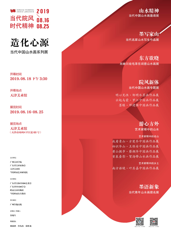 为全面贯彻党的十九大精神,以习近平新时代中国特色社会主义思想为指导,深入贯彻习近平总书记重要指示批示精神,繁荣发展社会主义文艺事业,推动文艺创新,由广州美术学院、广东省美术家协会、天津美术馆、当代岭南艺术研究院联合主办的“造化心源·当代中国山水画系列展”于2019年8月16日至8月25日在天津美术馆展出。此次展览共分为山水精神、墨写家山、东方欲晓、院风新体、游心方