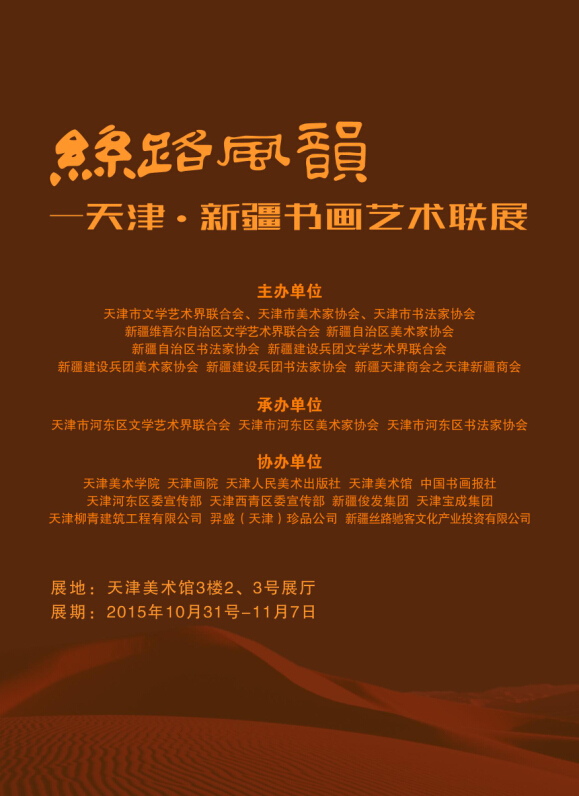 主办:天津市文学艺术界联合会、天津市美术家协会、天津市书法家协会、新疆维吾尔自治区文学艺术联合会、新疆自治区美术家协会、新疆自治区书法家协会、新疆建设兵团文学艺术联合会 |