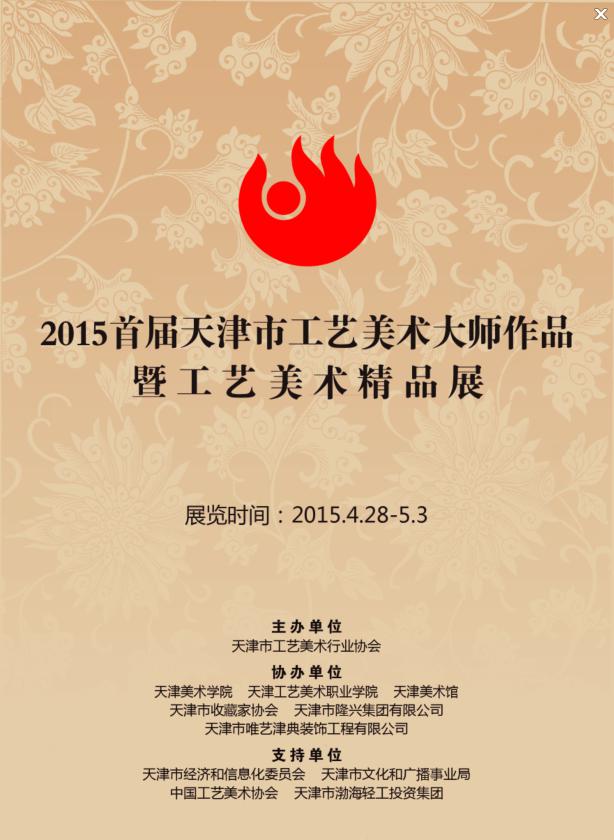 由天津市工艺美术行业协会主办,天津美术学院、天津市工艺美术职业学院、天津美术馆、天津市收藏家协会共同协办的“2015首届天津市工艺美术大师作品暨工艺美术精品展”于2015年4月28日在天津美术馆开幕。展览集中展示了我市工艺美术大师和工艺美术名家创作的200余件(套)作品,并且设置了三个展示区,分别展示了雕塑工艺品、金属工艺品、画类工艺品、漆器工艺品、陶瓷工艺品、地毯挂
