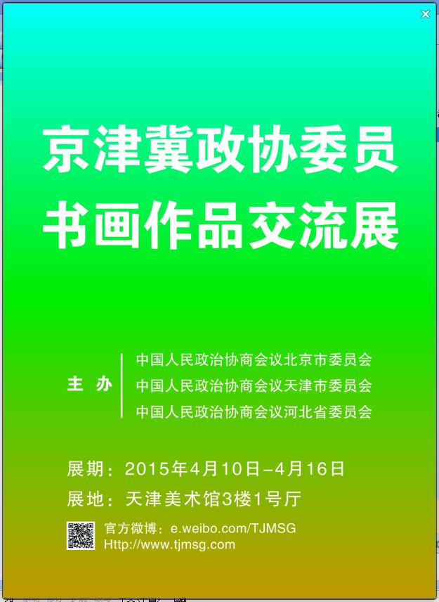 “京津冀政协委员书画作品交流展”将于2015年4月10日在天津美术馆开幕。京津冀三地书画艺术源远流长,文脉不息。举办这次交流展,旨在通过京津冀三地政协委员、书画家的作品,加强书画艺术交流,展示京津冀三地渊源深厚的历史文化,独具特色的地域风俗,深化三地联谊合作,推进京津冀协同发展。本次展出的一百余幅书画作品,题材丰富、艺术精湛、风格各异,豁人耳目。书画家们以独到的