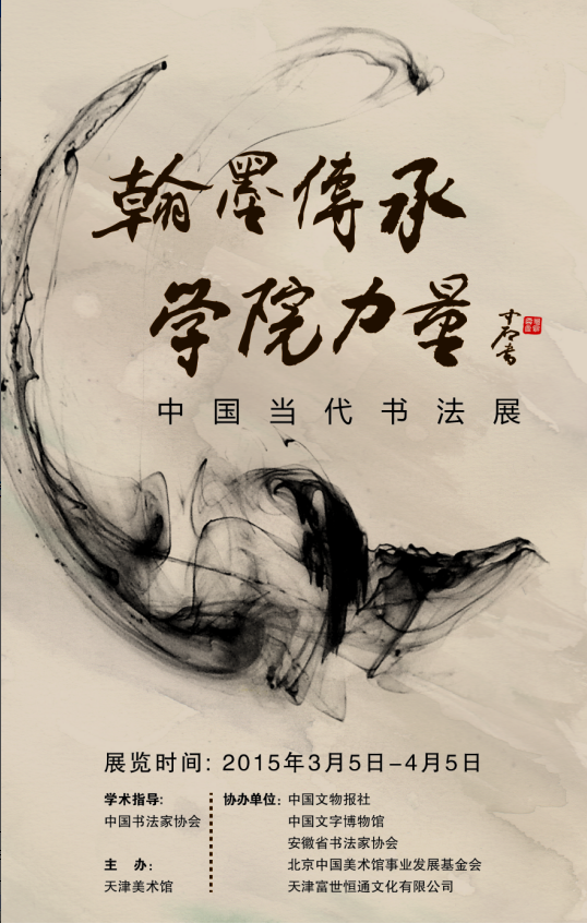 翰墨传承学院力量——中国当代书法展”将于2015年3月5日在天津美术馆展出。本次展览展出的144幅作品以“翰墨传承学院力量”为题,从作品上展示了两个层面的问题:发扬书法文化,并做到传承中的发展;这些书法作品是一个来自学院的群体的创作,他们的共同特点在于接受过系统的高等书法教育,据此,足以可见,“传承”和“发展”都是他们所要面临、并着力解决的重要课题。而这个课题是涉