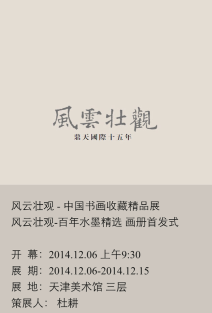 由天津博物馆、今晚传媒集团、天津美术馆、天津人民美术出版社、鼎天国际主办的“风云壮观——中国书画收藏精品展”将于2014年12月6日在天津美术馆展出。本次展览得到了众多收藏家、艺术机构、画家的支持和广大市民的热烈响应。经过专家的论证评选,最终从2000件送展作品中评选出150余幅参加本次精品展,作品涉及从近现代、现代到当代的众多艺术精品。展览将以学术划分为不同单元,呈