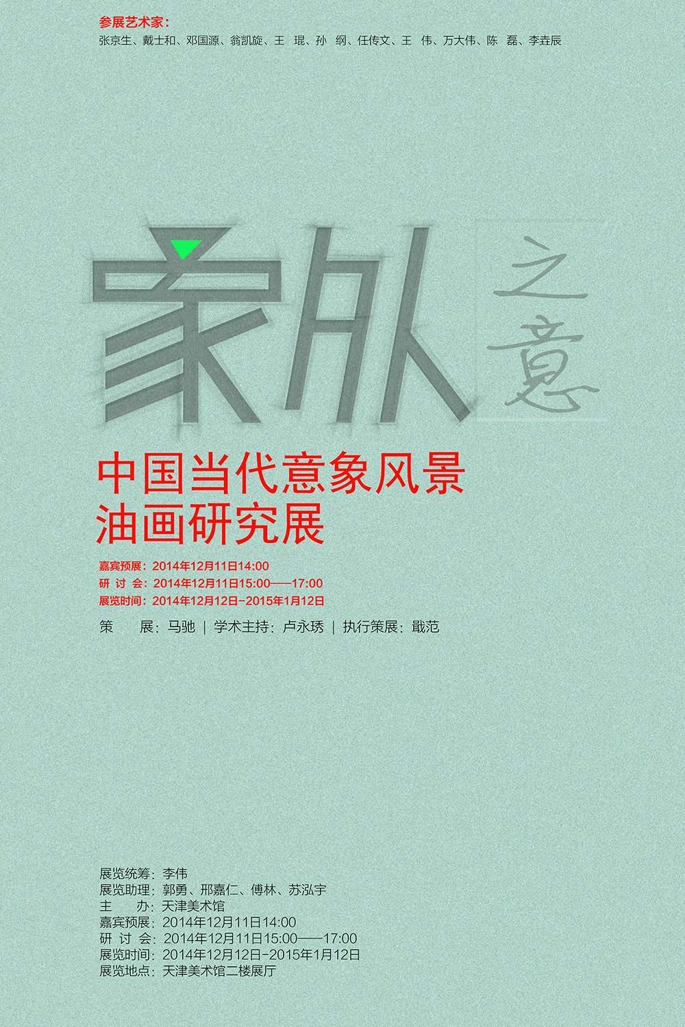 展览名称:象外之意——中国当代意象风景油画研究展参展艺术家:张京生、戴士和、邓国源、翁凯旋、王琨、孙纲、任传文、王伟、万大伟、陈磊、李垚辰展览时间:2014年12月12日-1月12日嘉宾预展:2014年12月11日14:00研讨会时间:2014年12月11日15:00-17:00策展:马驰学术主持:卢永琇执行策展:戢范展览统筹:李伟媒体宣传:李颖展览助理:郭勇、邢嘉仁、傅林、苏泓宇主办:天津美术馆