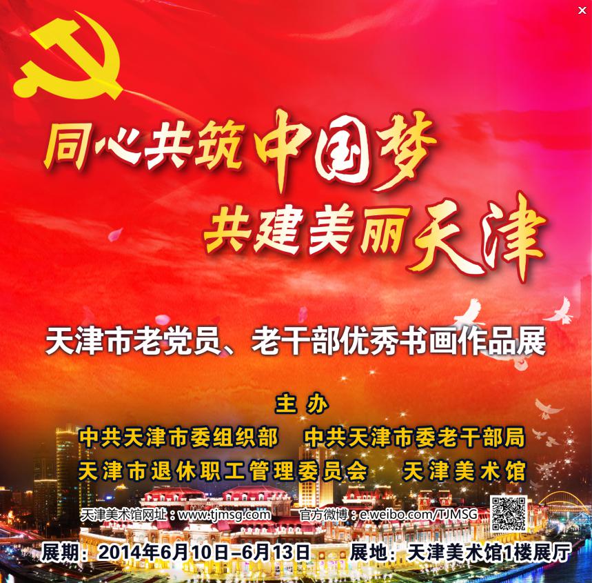 “同心共筑中国梦共建美丽天津——天津市老党员、老干部优秀书画作品展”将于2014年6月11日——6月13日期间在天津美术馆展出。本次展览在全市近千名离退休干部创作的一千多幅作品中,经过认真评选并展出180幅书画作品。老干部、老党员们用他们手中的笔记录大自然的五彩缤纷,记录着人生的多彩生活。也许他们的作品或许少了些艺术家的技巧,但多了对人民、对家乡的情感,对生活的感恩和