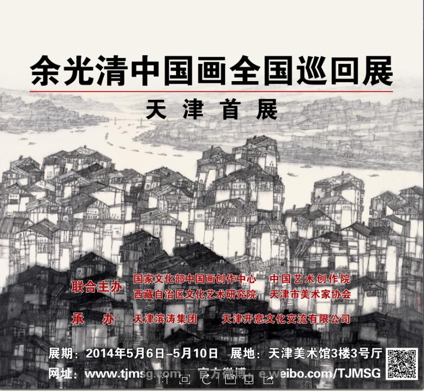 “余光清中国画全国巡回展——天津首展”将于2014年5月6日——5月10日期间在天津美术馆展出。本次展览展出余光清的画其题材主要是重庆山城,嘉陵江两岸层层叠叠的干栏式木屋、还有近年来创作的大足佛像石窟系列作品。他在传统的水墨运用中,也有着自己独得的理解,比如宿墨的妙用使他的作品营造一种具厚度的历史感,又以浓墨轻墨相渗和,在一种恰到好处的把握中,极妙地表现了山城的扑