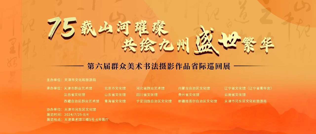 在喜迎中华人民共和国成立75周年、京津冀协同发展重大国家战略实施10周年的重要节点,由天津市文化和旅游局主办,天津、北京、河北、内蒙古、辽宁、江西、山东、四川、贵州、云南、西藏、青海、宁夏、新疆14省区市文化(群艺)馆及天津市河东区文化和旅游局联合承办,河东区文化馆协办的“75载山河璀璨共绘九州盛世繁华”——第六届群众美术书法摄影作品省际巡回展于7月25日在天津美术