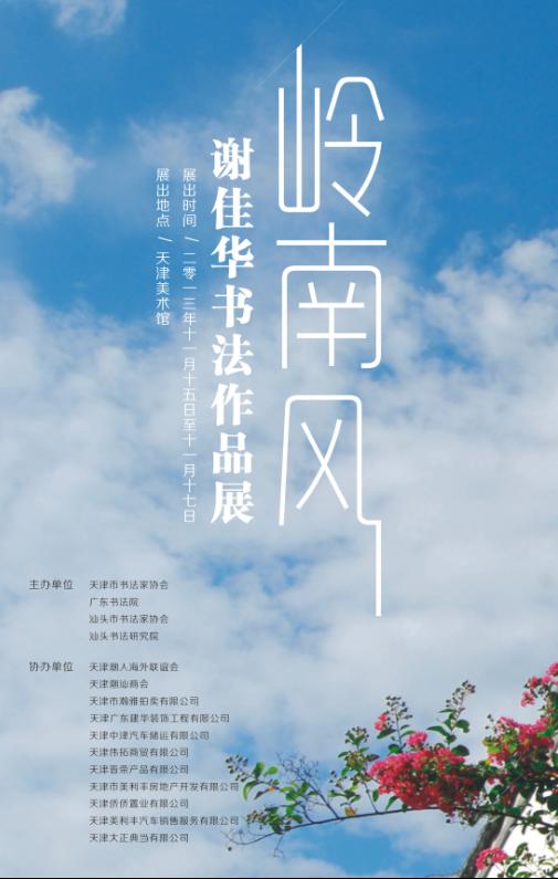“岭南风·谢佳华书法作品展”将于2013年11月15日——11月17日期间在天津美术馆展出。谢佳华书法笔法稳健,结构平和,浓淡枯湿相得益彰,彰显恬淡雅致,清逸率真之韵,取材广泛,视野开阔,于甲骨文、大小篆、分隶、魏碑、唐宋元明清各家各派书法无不广泛涉猎练习。其中最为擅长的是行草书法创作,既取法晋唐宋元的帖派名家,同时汲取明末王铎等的滋养,从而形成自己独特的书风。在本