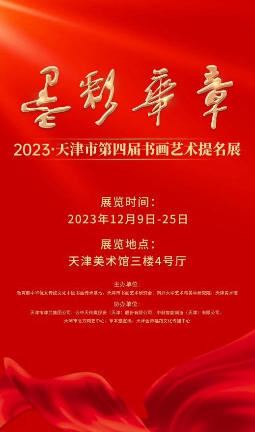 由教育部中华优秀传统文化中国书画传承基地、天津市书画艺术研究会、南开大学艺术与美学研究院、天津美术馆共同主办的《墨彩华章——天津市第四届书画艺术提名展》将于2023年12月9日至12月25日在天津美术馆三层四号厅举办。天津市书画艺术研究会老中青三代书画艺术家,心怀喜悦、满含深情,挥手中之笔、写胸中之意,讴歌着伟大祖国的繁荣富强,展现着中华艺术的不朽精神!作品内容丰富