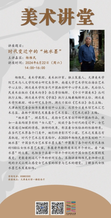讲座题目:时代变迁中的“她水墨”活动时间:2024年6月22日(周六)14:00-16:00活动地点:天津美术馆一楼报告厅主讲嘉宾杨维民,美术学教授、美术批评家、独立策展人、天津美术学院艺术与人