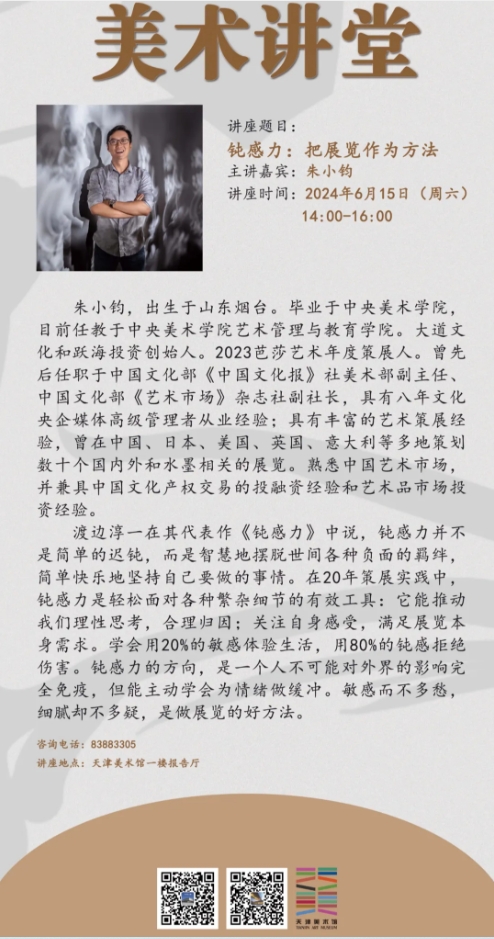 6月15日下午,天津美术馆“美术讲堂”邀请到中央美术学院艺术管理与教育学院教师,大道文化和跃海投资创始人,2023芭莎艺术年度策展人朱小钧老师为大家带来“钝感力:把展览作为方法”的公益