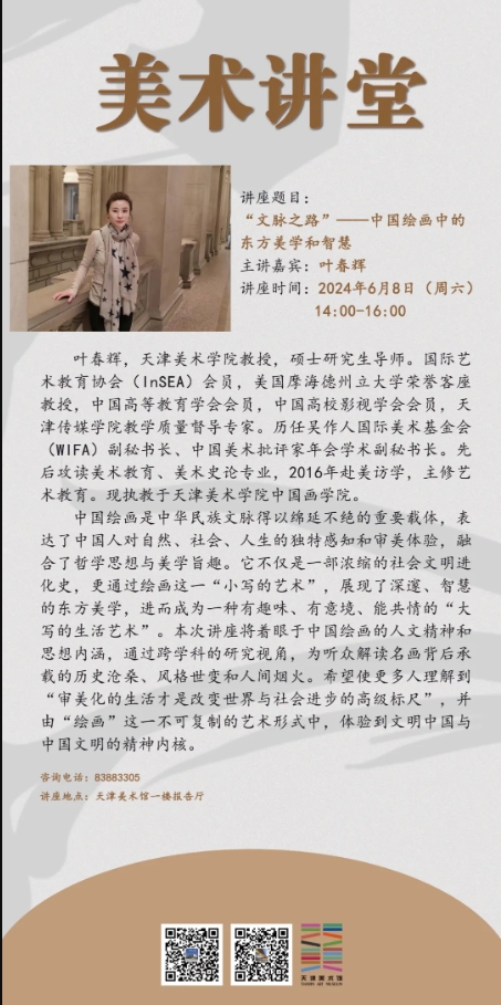 讲座题目:“文脉之路”——中国绘画中的东方美学和智慧活动时间:2024年6月8日(周六)14:00-16:00活动地点:天津美术馆一楼报告厅主讲嘉宾叶春辉,天津美术学院教授,硕士研究生导师。国际