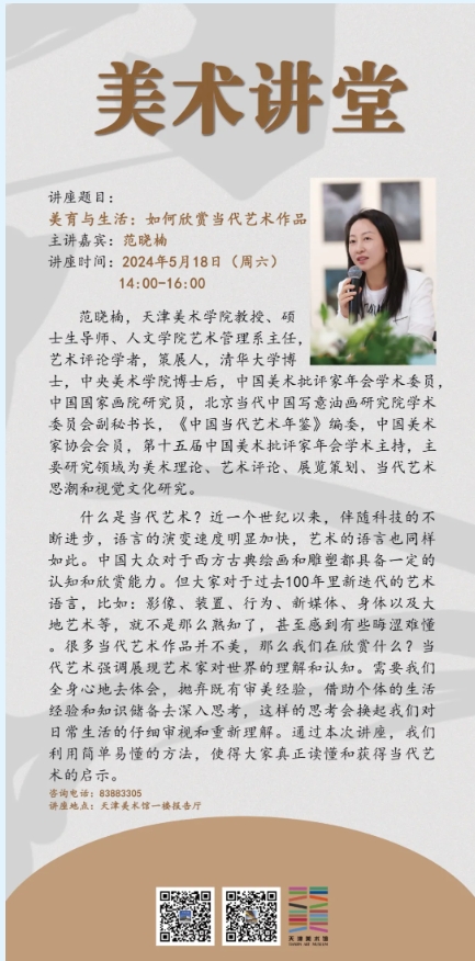 讲座题目:美育与生活:如何欣赏当代艺术作品活动时间:2024年5月18日(周六)14:00-16:00活动地点:天津美术馆一楼报告厅主讲嘉宾范晓楠,天津美术学院教授、硕士生导师、人文学院艺术管理