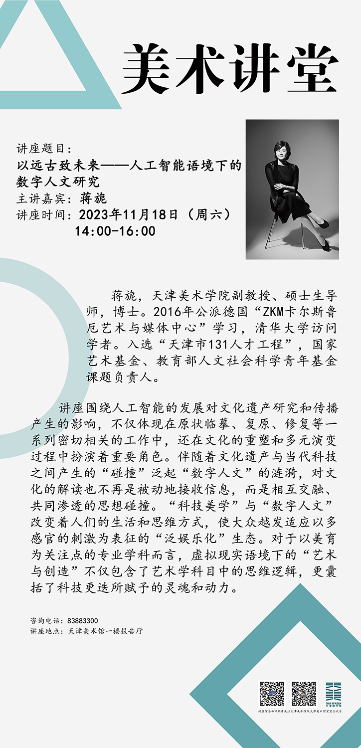讲座题目:以远古致未来——人工智能语境下的数字人文研究活动时间:2023年11月18日(周六)14:00-16:00活动地点:天津美术馆一楼报告厅主讲人简介:蒋旎,天津美术学院副教授、硕士生导师,