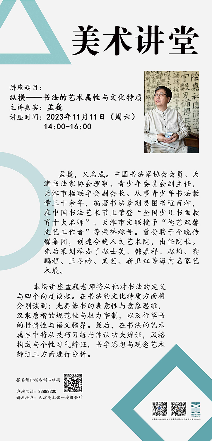 讲座题目:纵横——书法的艺术属性与文化特质活动时间:2023年11月11日(周六)14:00-16:00活动地点:天津美术馆一楼报告厅主讲人简介:孟巍,又名威。中国书法家协会会员、天津书法家协会理