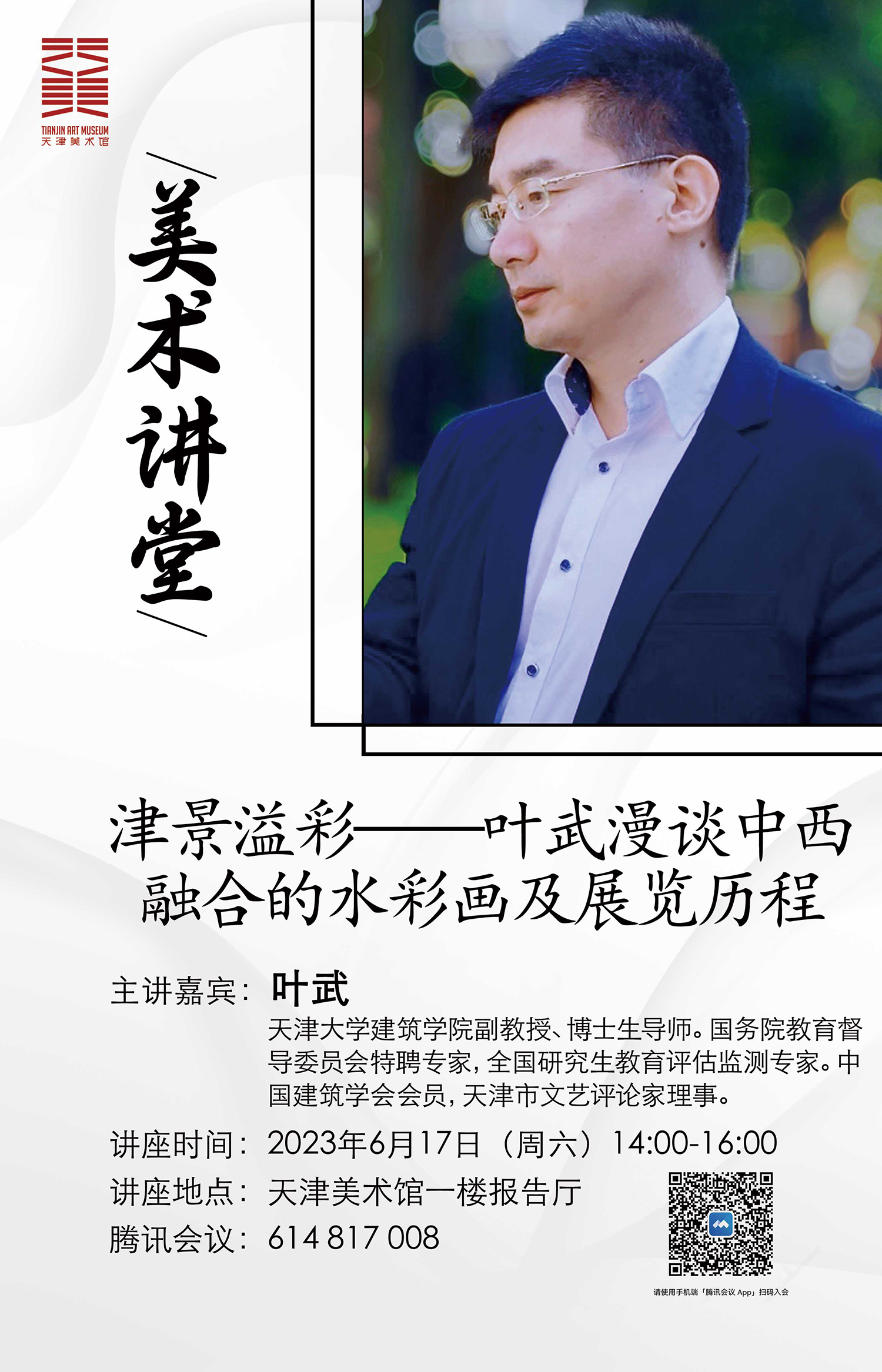 6月17日下午,天津美术馆“美术讲堂”特别邀请到天津大学建筑学院副教授叶武老师,为大家带来《津景溢彩——叶武漫谈中西融合的水彩画》公益讲座,本次讲座采用线上线下两种方式结合展开,方