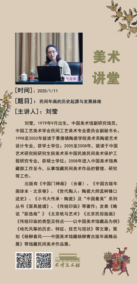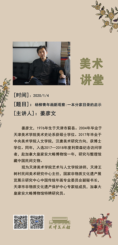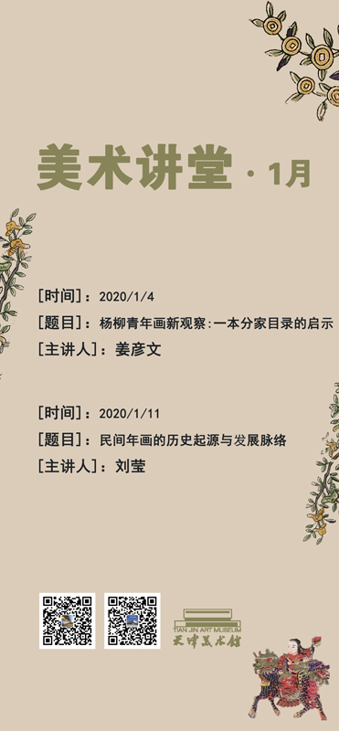 “美术讲堂”1月活动安排题目:《杨柳青年画新观察:一本分家目录的启示》时间:2020年1月4日(周六)14:00-16:00主讲人:姜彦文(天津美术学院艺术与人文学院讲师、天津王树村民间美术研究