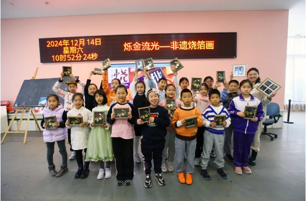 12月14日上午,天津美术馆举办了“烁金流光——非遗烧箔画”美术体验活动。活动伊始,主讲老师以饱满的热情向同学们介绍了烧箔画的工艺特点和历史传承,并与大家一同欣赏了优秀作品。接下来