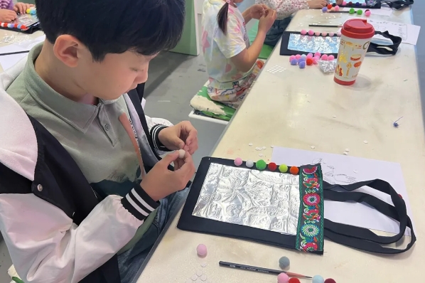 4月27日上午,天津美术馆举办了“背在身上的艺术·筒帕制作”美术体验活动。主讲老师带领同学们一起领略独特的少数民族服饰并学习了筒帕的制作过程。活动伊始,主讲老师播放了讲解视频,帮助