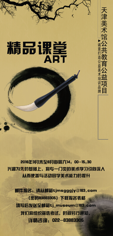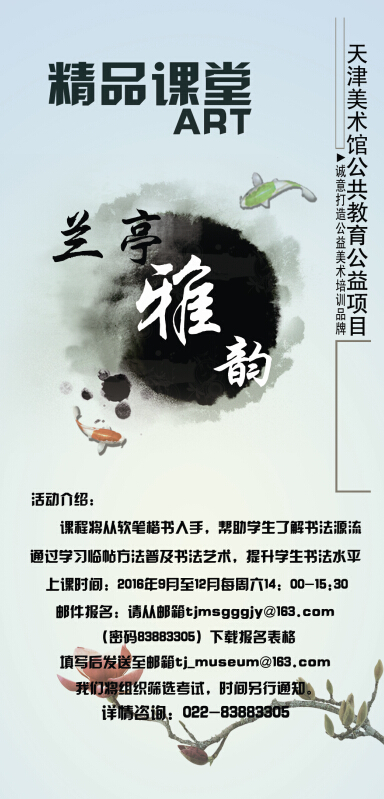 2016年3月,天津美术馆推出“美术精品课堂”系列公益活动,突出“提升少年儿童美术能力”的宗旨和特色,打造天津公益美术培训新品牌。本期“兰亭雅韵”少儿书法基本班针对8岁以上热爱软笔书