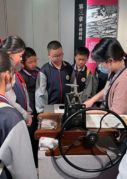 4月20日上午,天津美术馆迎来静海区瀛海学校小学部四、五年级师生参观“刀耕墨染救亡图存——天津博物馆馆藏版画展”、参与版画拓印活动,并为孩子们上了一堂主题为《一个两万五千里的奇迹》