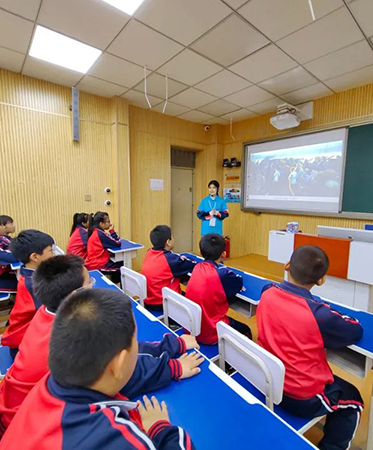 5月4日,青年节当天,天津美术馆“美术进校园”项目组来到静海区第十三小学开展《一个两万五千里的奇迹》——中小学博物馆示范课,由我馆青年志愿者李镕冰担当主讲。课程在悠扬的《十送红军