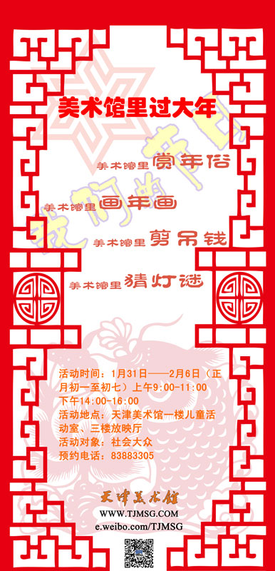 活动内容:(1)美术馆里赏年俗(2)美术馆里画年画(3)美术馆里剪吊钱(4)美术馆里猜灯谜活动时间:1月31日——2月6日(正月初一至初七)上午9:00-11:00下午14:00-16:00活动地点:天津美