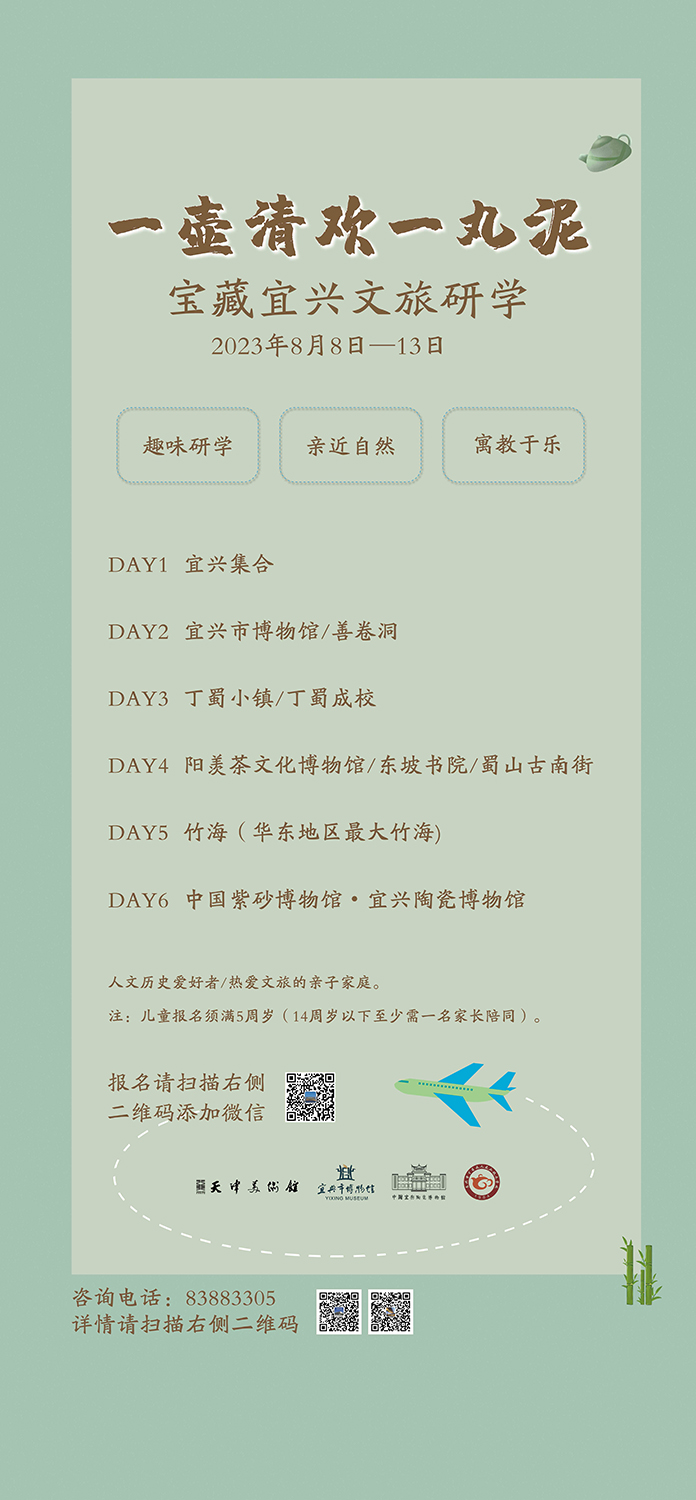 立秋时节,天津美术馆与22位大小朋友们相聚在太湖西岸,一座有着2200年悠久历史的文化名城——宜兴。在这里,我们听名人故事,了解宜兴历史,观前墅龙窑,探善卷洞,制作紫砂壶,体验采茶、